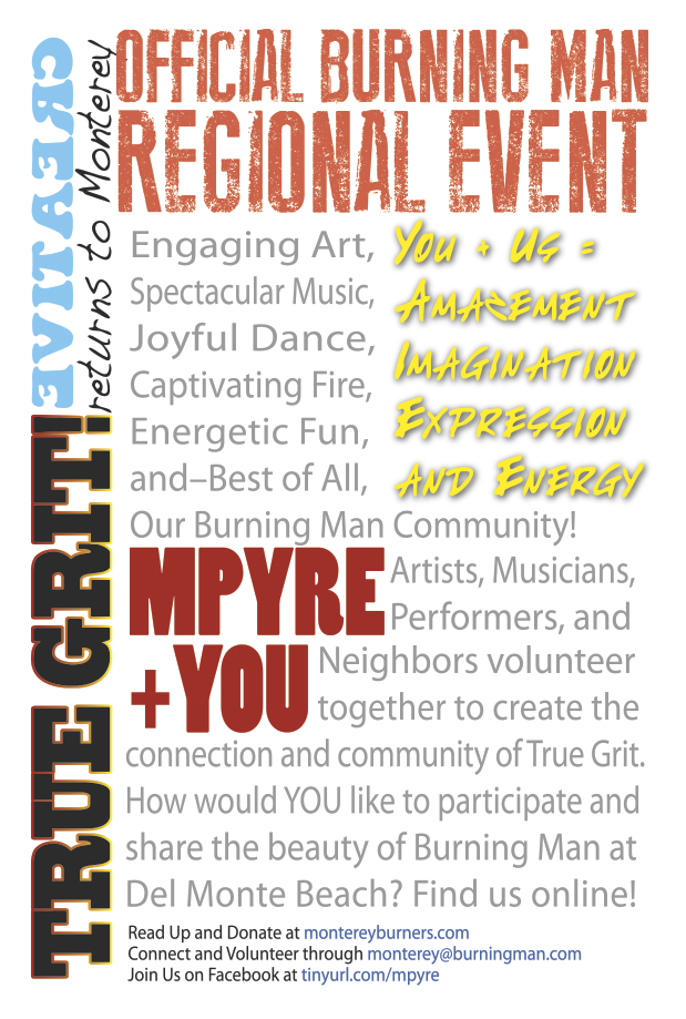 Thanks to Pinky and Kerry to taking the lead. Kerry will create a Google Docs greeter schedule with two people/hour. Look for the announcement when posted here, on Facebook, and through monterey-announce. In addition to receiving donations, greeters represent MPYRE and Burning Man to our local neighbors and complete strangers—all who walk by and wonder who we are and what we’re doing! It’s an important job, and you’re just the person to dispense the words of wisdom and charm!