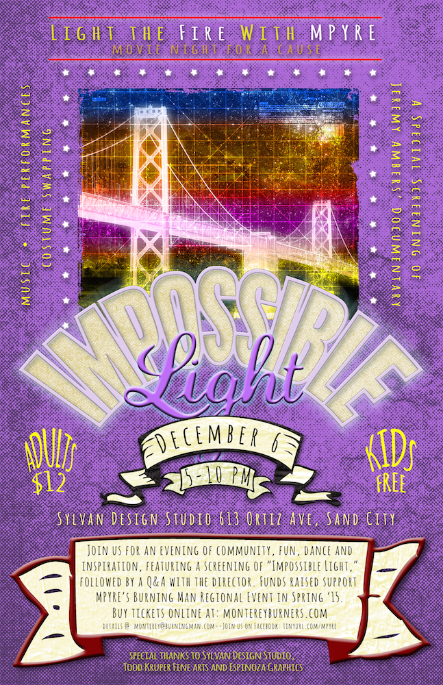We gather to raise production funds for MPYRE’s annual beach burn–the only ongoing Official Burning Man Regional Event that is Free-to-the-Public. Look for MPYRE Strikes Back at Del Monte Beach in Spring 2015!
